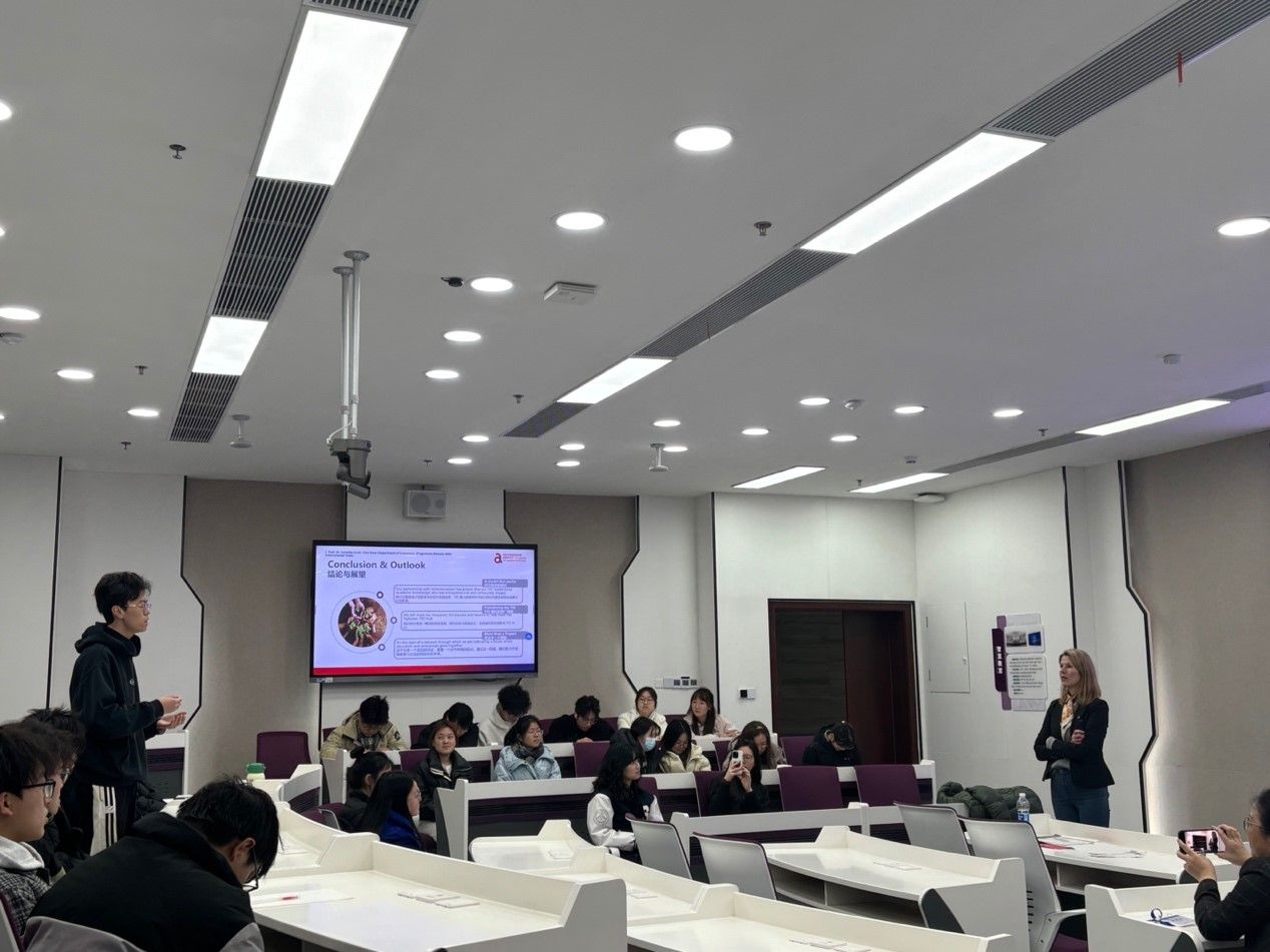 讲座中,Scott教授凭借富有感染力的表达与幽默风趣的语言,向在场学生生动阐释了安大注重实践与产教融合的办学理念。她以“TEE原则”为核心,重点分享了聚焦Schloss Hohenerxleben古堡改造的经典校企合作案例,并详细剖析了该项目的完整实践路径:由企业合作伙伴HoErx为学生提供真实的商业挑战课题,校企双方在学生的深度参与下开展头脑风暴与联合研究,运用商业咨询式的分析方法,最终提出可持续的创新方案并成功落地,获得了当地政府的高度表彰。