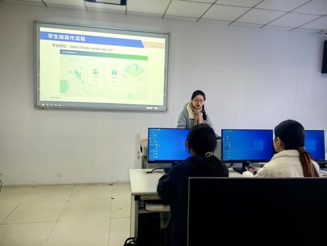 本次培训更加突出“现场实操”和“过程把关”。11月24日至26日三天时间里,刘钰潇老师先后为三个专业开展注册辅导,采用“统一讲解 + 分步演示 + 巡回答疑”的形式,组织学生当场打开系统、同步操作。对同学们在实际填报中遇到的具体问题,逐条解答,对个别操作困难的同学进行一对一指导,确保每人都能在培训讲解期间完成注册,并现场进行核对与确认。